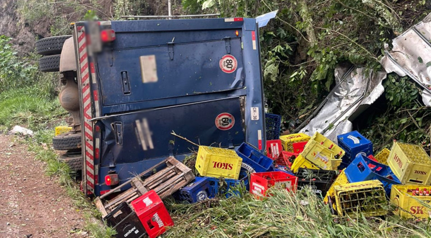 Um caminhão com placas de Chapecó saiu da pista em uma curva, e capotou ao lado da rodovia. O motorista, um homem de 44 anos, queixava-se de tontura, mas não tinha ferimentos aparentes.