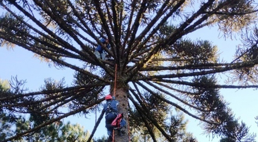 No local, os socorristas constataram que a vítima, de 47 anos, estava presa na copa da árvore de aproximadamente 25 metros de altura. O homem relatou que subiu para colher pinhão, mas acabou deixando cair parte dos materiais de segurança, impedindo sua descida.