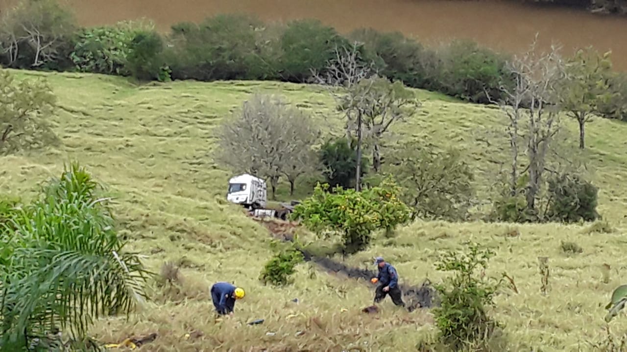 Na manhã desta quarta-feira (23), a reportagem acompanhou uma equipe do Corpo de Bombeiros no local. O caminhão foi localizado caído em uma ribanceira, a mais de 100 metros do asfalto, em local de difícil acesso.