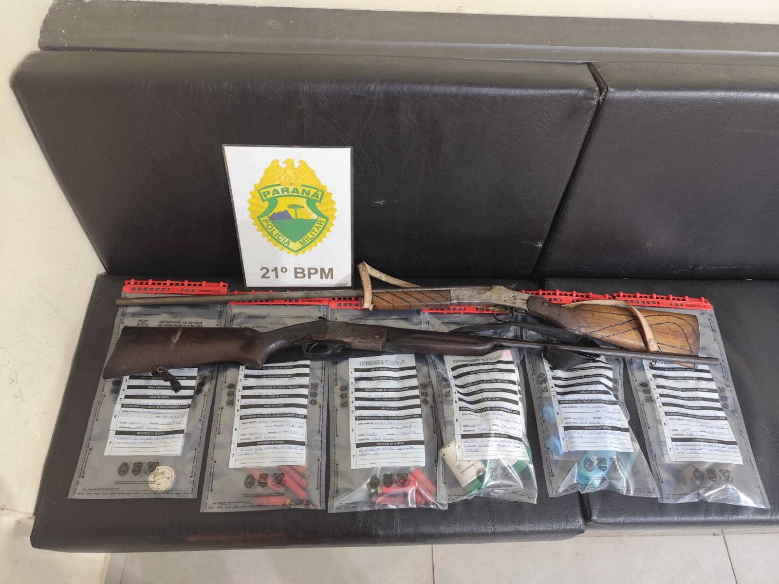 Durante a abordagem na residência, foram apreendidas duas espingardas calibres .32 e .36, além de munições, cartuchos deflagrados, espoletas, pólvora, chumbo e equipamentos para recarga artesanal.