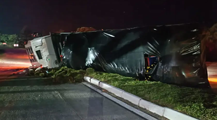Um caminhão tombou na madrugada de sexta-feira (20), por volta das 02h30, na PRC-280, Km 156, em Clevelândia, no Paraná, deixando duas pessoas feridas.