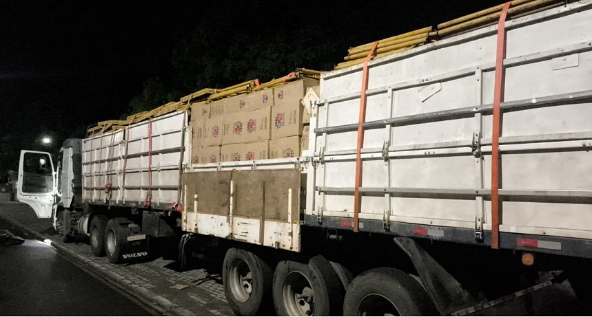 Durante a abordagem, o condutor, de nacionalidade estrangeira, informou inicialmente que transportava painéis modulares utilizados na construção civil. No entanto, ao realizar vistoria no compartimento de carga, os policiais visualizaram, por meio das aberturas, caixas de papelão contendo cigarros.