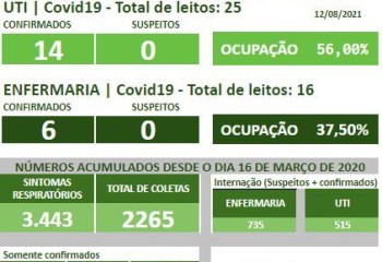 Também foram registradas 2 altas hospitalares: pacientes de Dionísio Cerqueira e São João do Oeste. Além de 2 altas de pacientes que estavam na UTI para a enfermaria. A ocupação de hoje é de 14 pacientes confirmados na UTI. Na enfermaria são 6 confirmados.