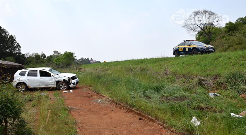 O carro acabou batendo na lateral da cabine do caminhão e foi arremessado da pista, capotando.