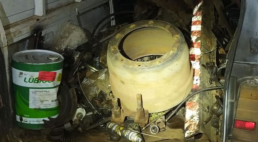 Segundo informações,após disparo de alarme as 05h da manhã a equipe deslocou até uma oficina mecânica que está sob judice por crimes de receptação, adulteração de chassis e demais crimes. No interior da oficina foi localizado um veículo e dois homens, no veículo um furgão pequeno estava cheio de peças dos caminhões que ali estavam. Os suspeitos de 25 e 30 anos, oriundos de Santa Catarina foram encaminhados a 19 SDP.
