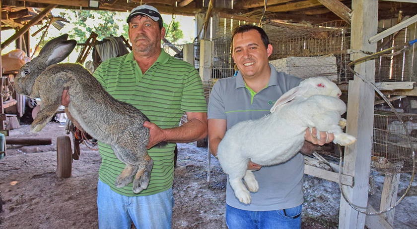 Na ocasião, conversamos com o engenheiro agrônomo, cunicultor e proprietário da Cunicultura GR, Geovane Ruschel e seu pai, Silmar Carlos Ruschel, seu Carlinhos como é conhecido, além de Cunicultor, atua como produtor de mandioca, tendo um negócio rentável e de muitas vendas no comércio local.
