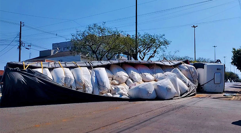 Ele estava carregado com 37 toneladas de farelo de arroz moído. Ao fazer a curva para adentrar a avenida, a carga da carreta pendeu, tombando. O motorista, morador de Curitiba, não teve ferimentos.